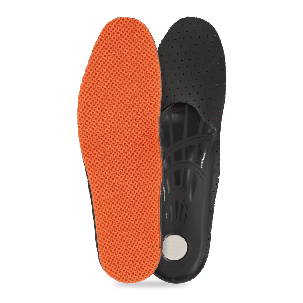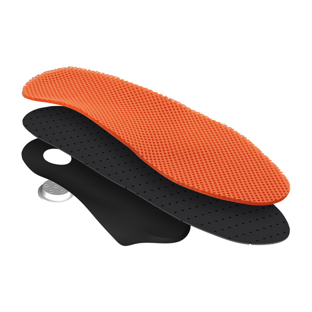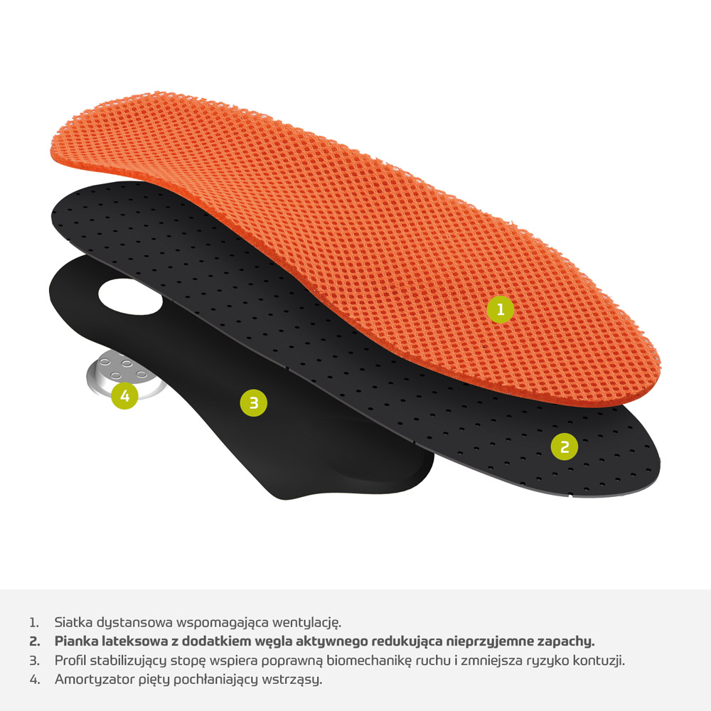 Wkładki ACTIVE SPORT są idealne dla osób uprawiających sport i pracujących w ciężkich warunkach. Warstwa wierzchnia to miękka siatka dystansowa, idealnie odprowadzająca wilgoć. Środkowa warstwa wykonana jest z pianki lateksowej wzbogaconej o zawartość węgla aktywnego. Delikatna pianka pełni funkcję amortyzatora, łagodząc mikrowstrząsy i zwiększając komfort użytkowania. Zawartość węgla aktywnego niweluje nieprzyjemne zapachy. Zastosowany elastyczny profil z odciążeniem w pięcie, wspiera łuk podłużny i amortyzuje cały układ ruchu.