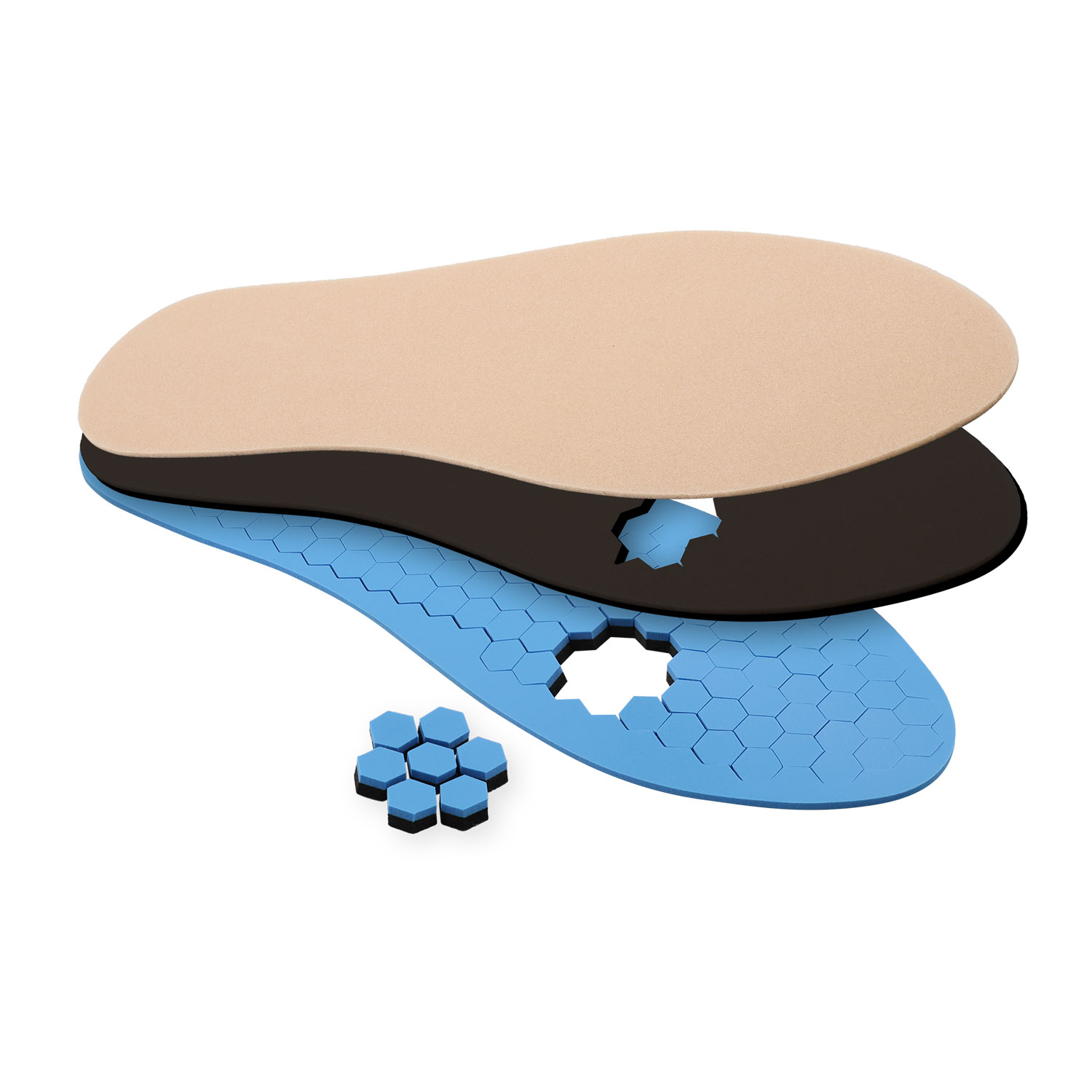 – Sześciokątne elementy wkładki mogą być selektywnie usuwane, tworząc strefy zmniejszonego nacisku i indywidualnego odciążenia wybranych obszarów stopy.