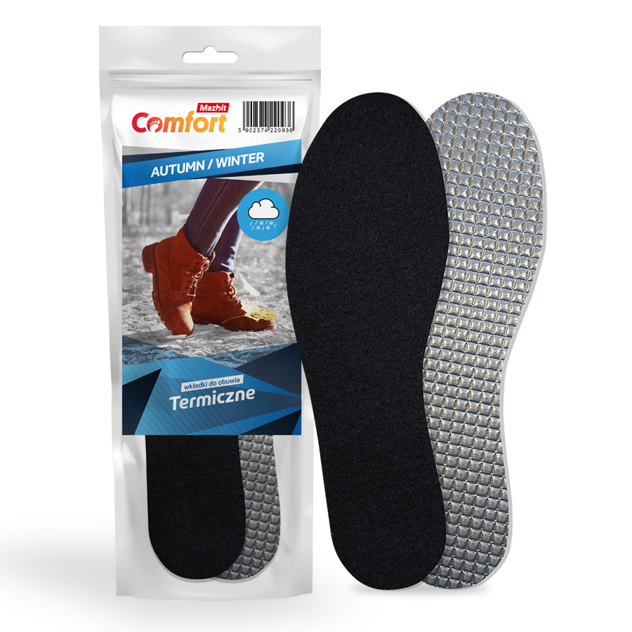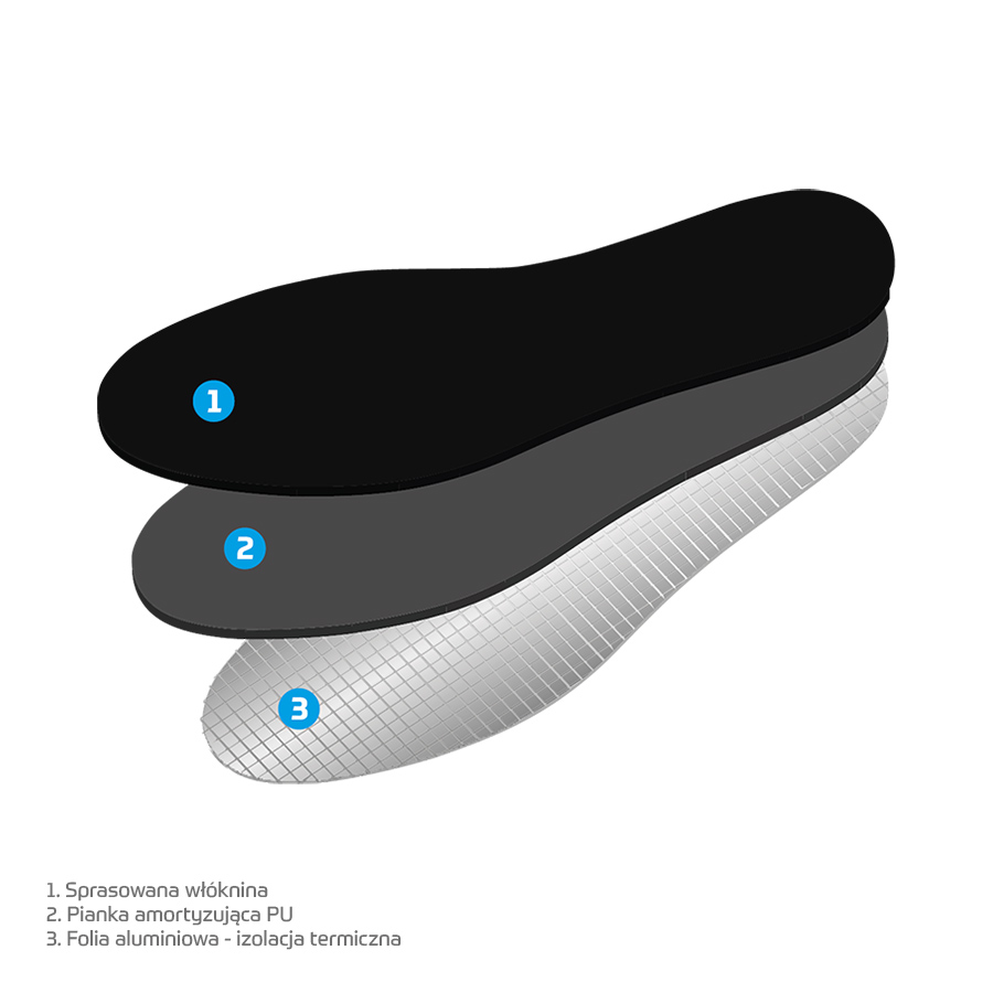 Wkładki TERMICZNE są idealne dla osób aktywnych lub pracujących w ciężkich warunkach. Wykonane ze sprasowanej włókniny oraz miękkiej pianki, pokrytej od spodu folią aluminiową. Delikatna włóknina ogrzewa stopy w niskich temperaturach, jednocześnie zapewniając doskonałą cyrkulację powietrza. Warstwa spodnia wkładek pełni funkcję termoizolacyjną, chroni stopy przed nadmiarem wilgoci oraz zapewnia odpowiednią amortyzację podczas chodu, łagodząc mikrowstrząsy. Zalecane w szczególności do obuwia zimowego oraz roboczego.