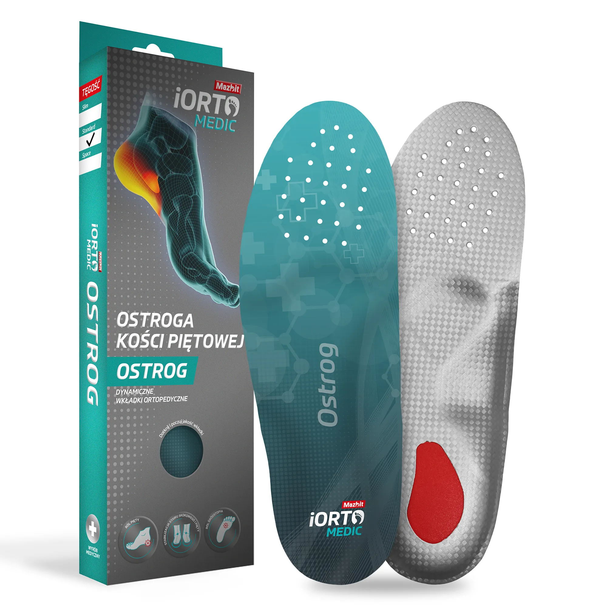 Wkładki iORTO MEDIC Ostrog są niezawodnym wsparciem w terapii ostrogi piętowej, nawracających bólów pięt, a także zapalenia ścięgna Achillesa. Ból w okolicach pięt oraz nawracające zapalenia ścięgna Achillesa (wywołane np. intensywnym uprawianiem turystyki górskiej, pracy stojącej), które powodują dysfunkcję w pracy stawów kolanowych i utrudniają lub całkiem uniemożliwiają chodzenie, mogą być eliminowane przy pomocy specjalnie przygotowanych wkładek. Wkładki iOrto Medic Ostrog wpływają na równomierny nacisk stopy na podłoże, odciążając ją i redukując ból. Mają również specjalne wyprofilowanie odciążające piętę oraz przodostopie, co wraz z zastosowaniem pianki z pamięcią kształtu, pozytywnie wpływa na zmniejszenie nacisku w przodostopiu i zapobiega powstawaniu modzeli i odcisków. Odciążenie pięty dodatkowo powoduje zmniejszenie problemu ze zgrubieniami pięty i ich pękaniem, a także – zmniejszenie dolegliwości bólowych kręgosłupa i kolan.
