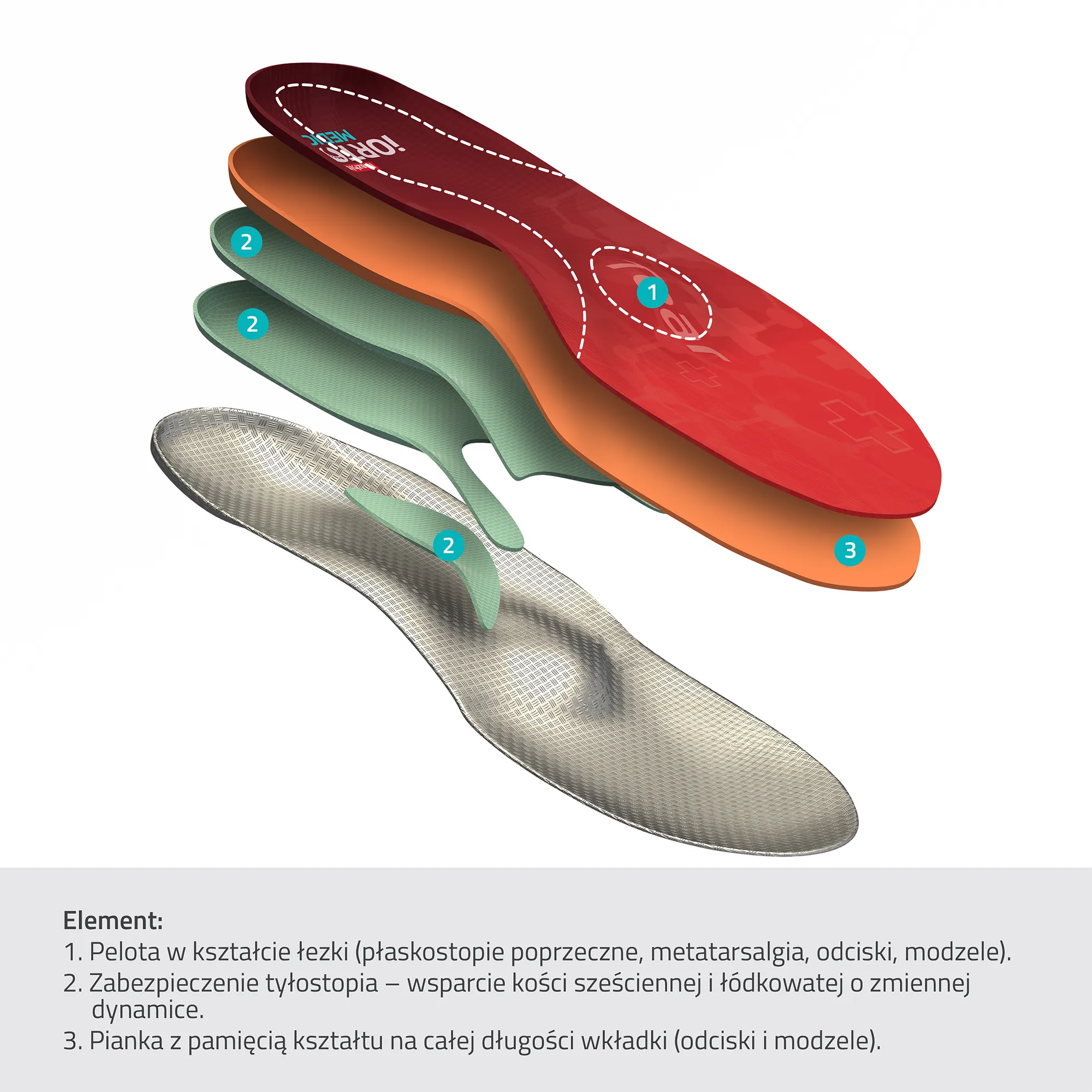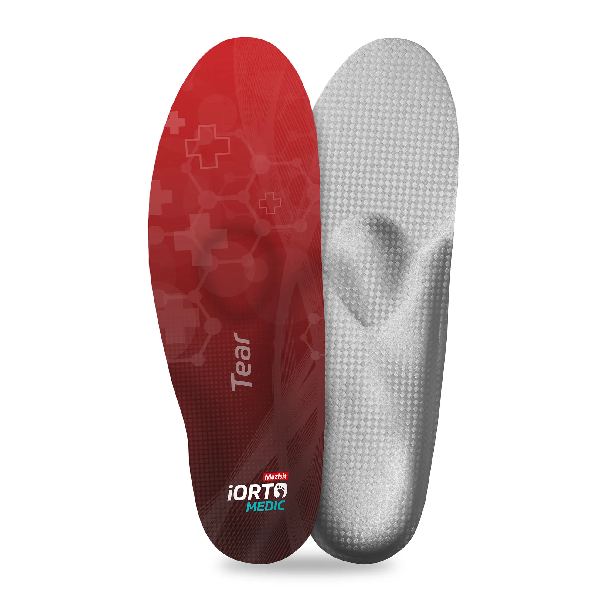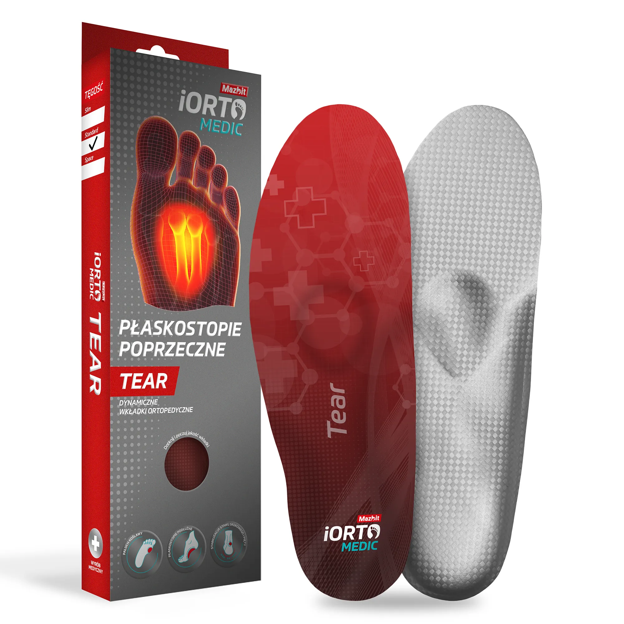 Wkładka iORTO MEDIC Tear stworzone są z myślą o osobach z płaskostopiem poprzecznym. W jej produkcji zastosowano dwie technologie: wsparcie łuku podłużnego stopy o zmiennej dynamice dostosowane do wagi użytkownika oraz wsparcie łuku poprzecznego stopy, które uzyskuje się dzięki wykorzystaniu peloty w kształcie kropli podpierającej II i III głowę kości śródstopia. Taka budowa pozwala na eliminację przyczyny schorzenia i aktywizuje stopę do prawidłowego przetaczania.