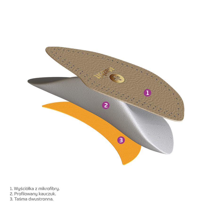 Klin należy dopasować do stopy tak aby przypadał pod łukiem podłużnym i przykleić do buta.