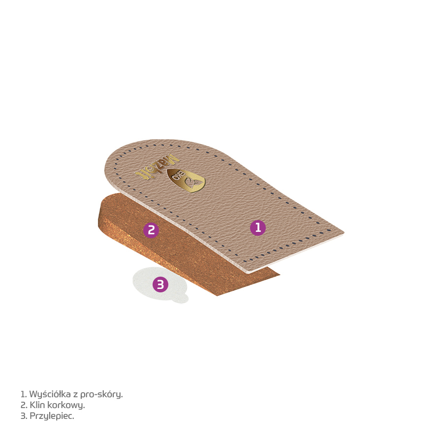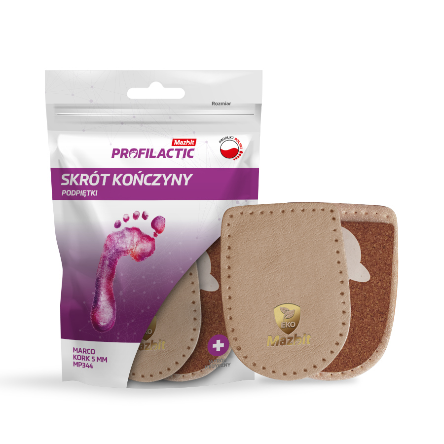 Zastosowany w nich korkowy profil pozwala podeprzeć piętę krótszej nogi i tym samym wyrównać asymetrię długości nóg bez konieczności kupowania dwóch różnych butów i stosowania obcasów. Podpiętki umożliwiają wyrównanie skrótu o 5 lub 10 mm. Wyściółka z pro-skóry jest przyjemna w dotyku i zmniejsza ryzyko odparzeń oraz powstawania odcisków. Do utrzymania jej w czystości wystarczy wilgotna szmatka i delikatny detergent.