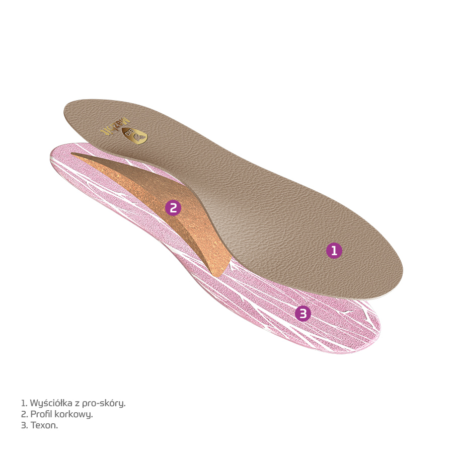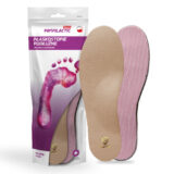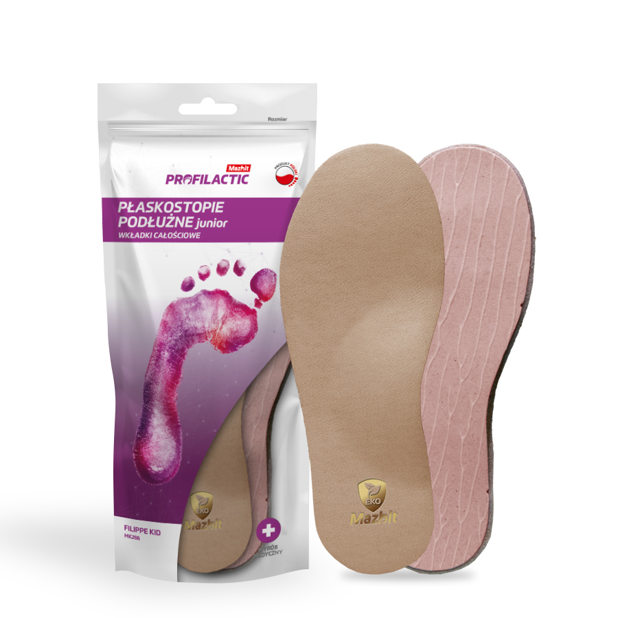 Wkładki FILIPPE dedykowane są osobom z płaskostopiem podłużnym. Dzięki sztywnemu korkowemu wyprofilowaniu wkładka mocno wspiera łuk podłużny – nie pozwalając na jego opadnięcie. Wkładki posiadają wyściółkę z pro-skóry, która zapewnia dobre odprowadzenie potu i jest bezpieczna dla wrażliwej skóry. Spodnia warstwa stworzona jest z wytrzymałego texonu. Ten wyrób medyczny zalecany jest przez specjalistów dla osób potrzebujących mocnego wsparcia w terapii.
