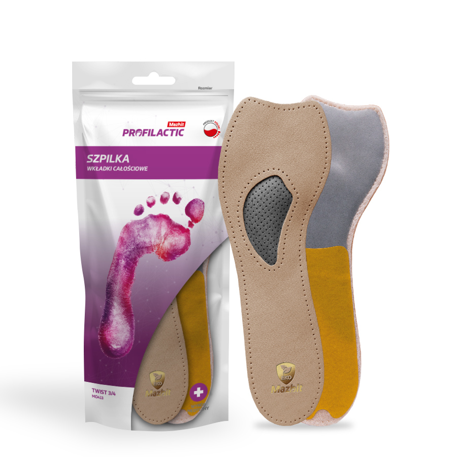 Wkładki TWIST ¾ są wyrobem medycznym stworzonym z myślą o kobietach cierpiących na płaskostopie poprzeczne. Posiadają pelotę w kształcie fasolki wspierającej II i III głowę kości śródstopia, co wspiera terapię płaskostopia poprzecznego i odciąża przodostopie. Na całej długości zastosowana została miękka pianka lateksowa zapewniająca odczucie komfortu. Wkładki te świetnie sprawdzą się w wąskim obuwiu typu baleriny i w butach z odkrytymi palcami. W wysokich obcasach pełnią funkcję hamulca stopy.