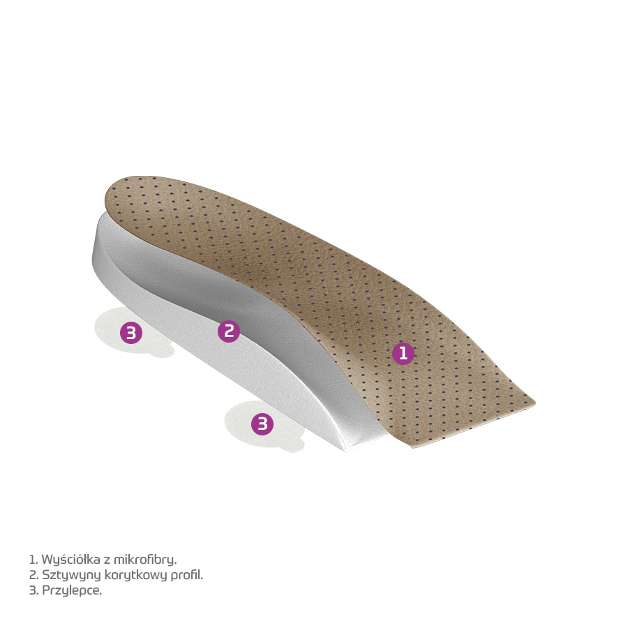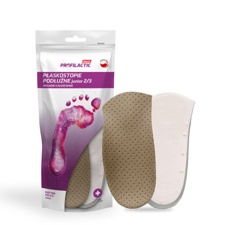 Wkładki MATTEO KID 2/3, są wyborem medycznym dedykowanym dla osób z płaskostopiem podłużnym oraz koślawością lub szpotawością tyłostopia. Stabilizacja tyłostopia uzyskiwana jest dzięki głębokiemu korytku, który utrzymuje tyłostopie w odpowiedniej pozycji. Dodatkowo wkładka posiada wyprofilowanie pod sklepieniem podłużnym, dzięki czemu wspiera terapię płaskostopia podłużnego.