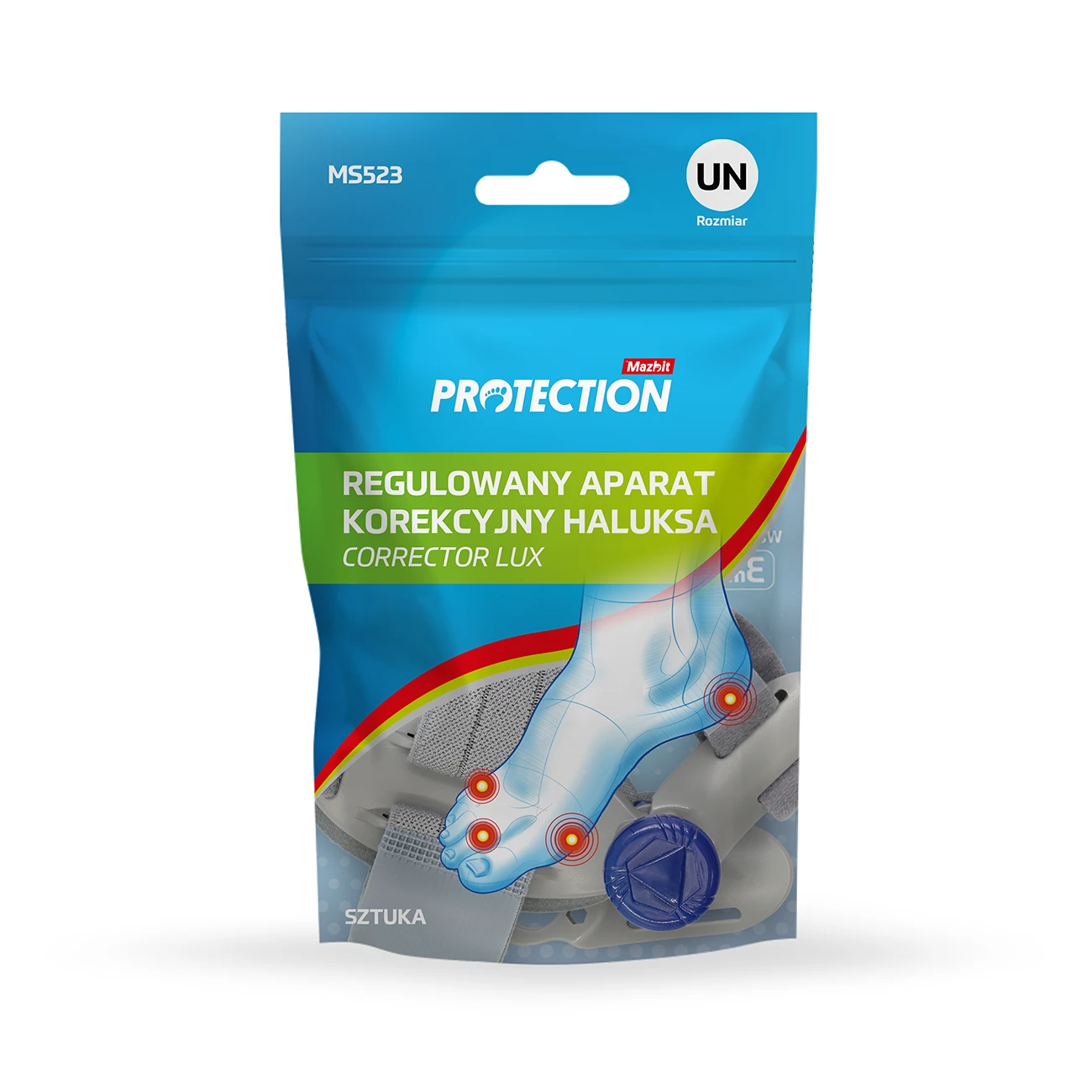 Corrector Lux – Komfort i Skuteczna Korekcja! Innowacyjny mechanizm korygujący z precyzyjnym pokrętłem umożliwia stopniowe regulowanie nacisku przy nasadzie palucha, delikatnie wypychając go do prawidłowego ustawienia bez ograniczania ruchu. Trzy stabilne rzepy gwarantują idealne dopasowanie, a pasek na piętę zwiększa stabilność podczas chodu. Miękkie, żelowe wykończenie chroni skórę przed otarciami i zapewnia komfort nawet przy dłuższym noszeniu. Regularne stosowanie Corrector Lux wspiera stopniową korekcję deformacji, redukcję bólu i może zapobiec konieczności operacji.