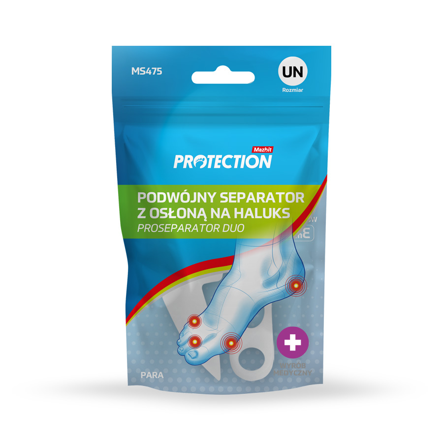 Podwójny separator z osłoną na haluks (bunion). Osłania palce i pomaga je prostować. Dwa pierścienie stabilizują klin, zapobiegając jego zsuwaniu. Elastyczny żel oraz olej klasy medycznej.