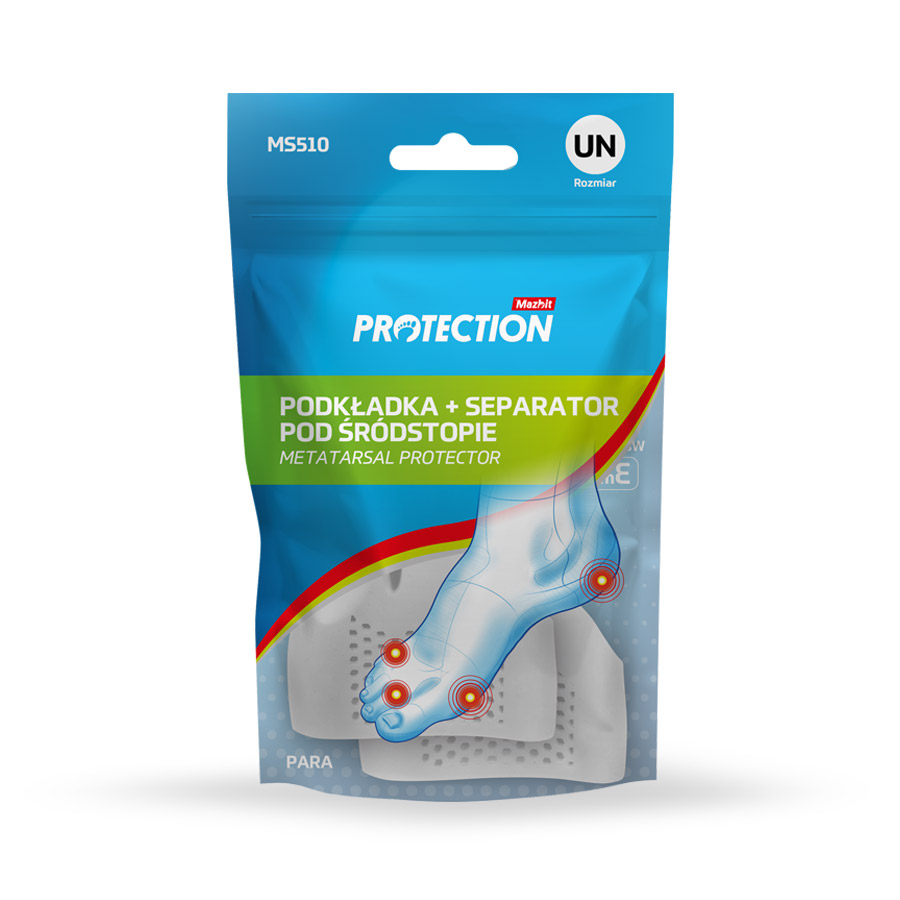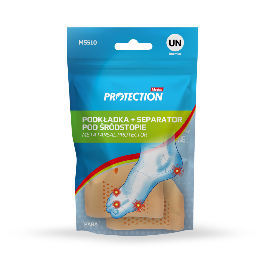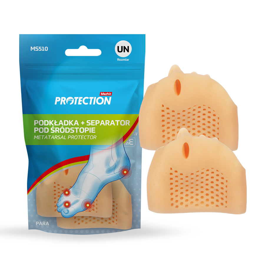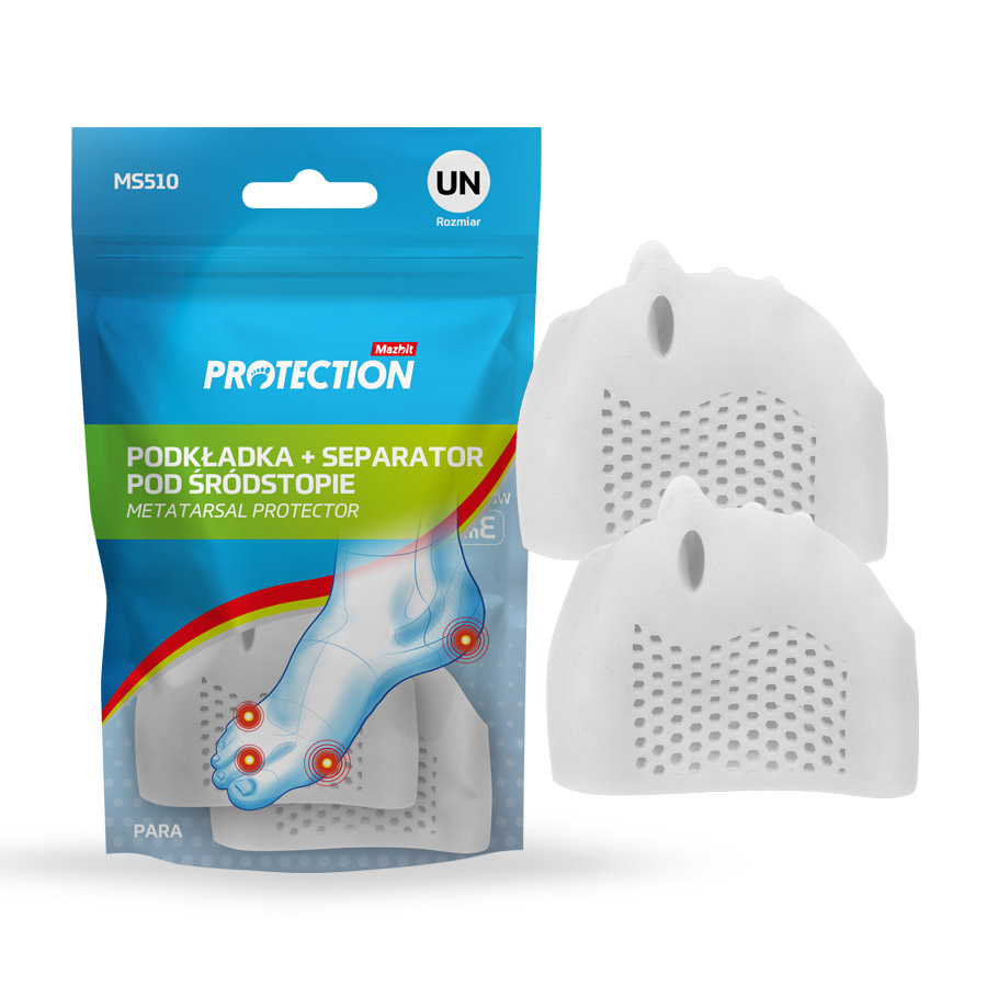 Zastosowanie: Poduszka pod przodostopie połączona z separatorem palców. Zabezpiecza przed bólem, osłania bunion, separuje palce ustawiając je w prawidłowej pozycji. Pozytywnie wpływa na walkę z bólem, otarciami i odciskami w okolicach przodostopia. Sprawdza się nie tylko w obuwiu zamkniętym.